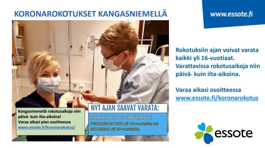 Julkaistu: 3.6.2021 Koronarokotukset Kangasniemellä Nyt rokotusajan saavat varata kaikki 16 vuotta täyttäneet. Varaa aika tästä! Koronarokotustiedote tästä linkistä!