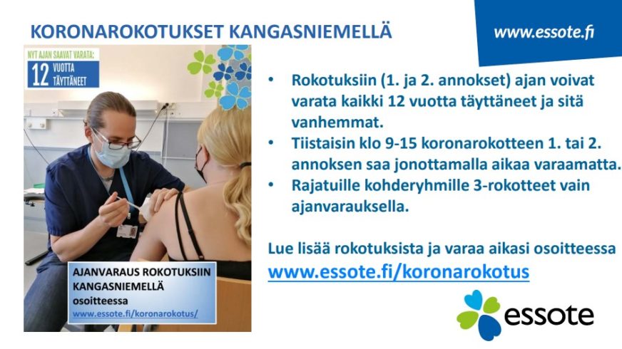 Julkaistu: 20.10.2021 Koronarokotukset Kangasniemellä Lue lisää rokotuksista ja varaa aikasi osoitteessawww.essote.fi/koronarokotus