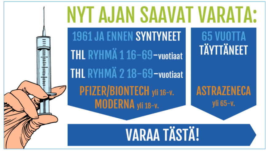 Julkaistu: 20.4.2021 Koronarokotukset 1961 tai ennen syntynyt, tai 16-69-vuotias THL:n riskiryhmään 1 kuuluva, tai 18-69-vuotias THL:n riskiryhmään 2 kuuluva, tai yli 65-vuotias, VARAA AIKA TÄSTÄ.