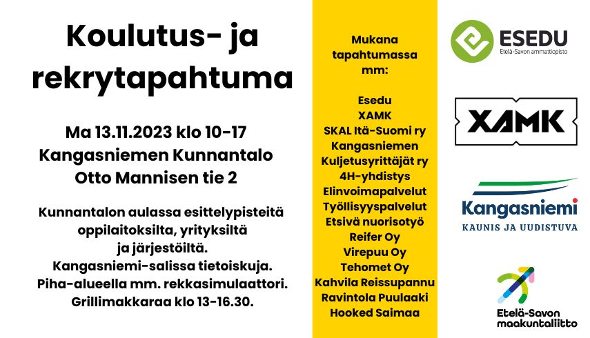 Ma 13.11.2023 klo 10-17 järjestetään Kangasniemellä Koulutus- ja rekrytapahtuma yhteistyössä useamman tahon kanssa. Tapahtumapaikkana on Kangasniemen Kunnantalo, Otto Mannisen tie 2.