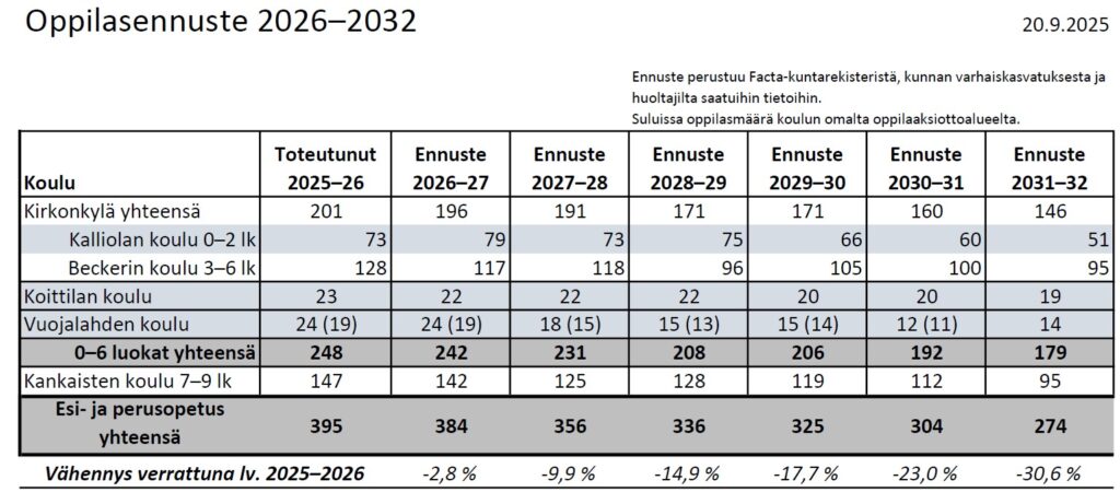 Oppilasennusteen perusteella Vuojalahden koulun oppilasmäärän arvioidaan laskevan pysyvästi alle 20 oppilaan lukuvuodesta 2027–2028 alkaen, mikä tarkoittaa, että koulun toiminta otetaan tarkempaan tarkasteluun kunnanvaltuuston linjausten mukaisesti. Tällä hetkellä Vuojalahden koulussa on 24 oppilasta, eikä oppilasmäärä ennusteen mukaan laske vielä tulevan lukuvuoden 2026–2027 aikana.