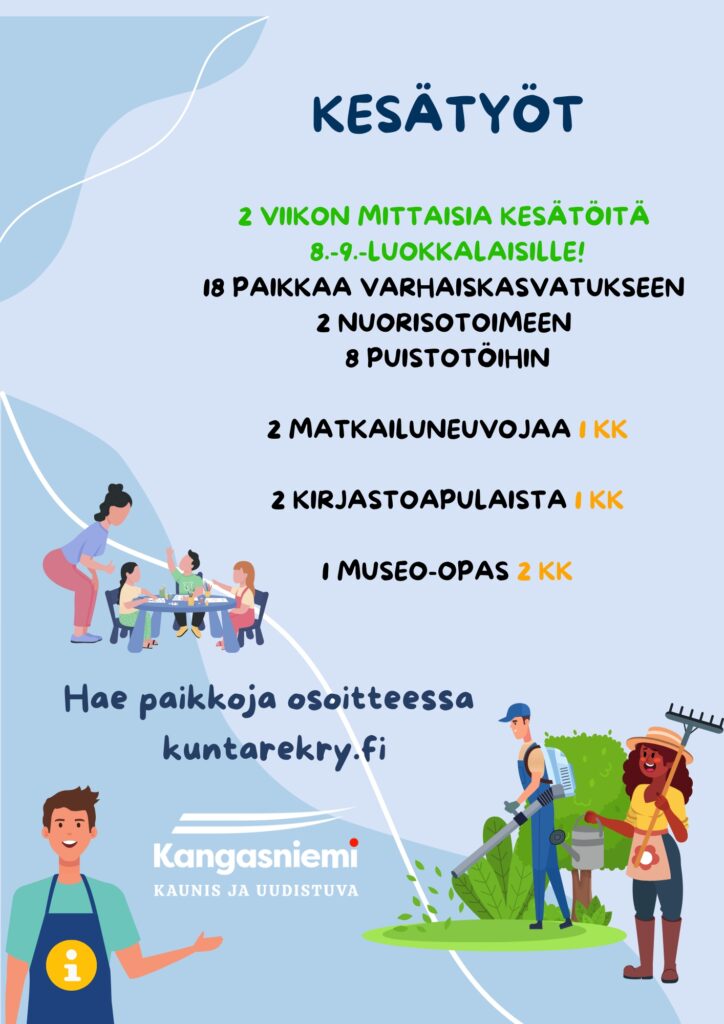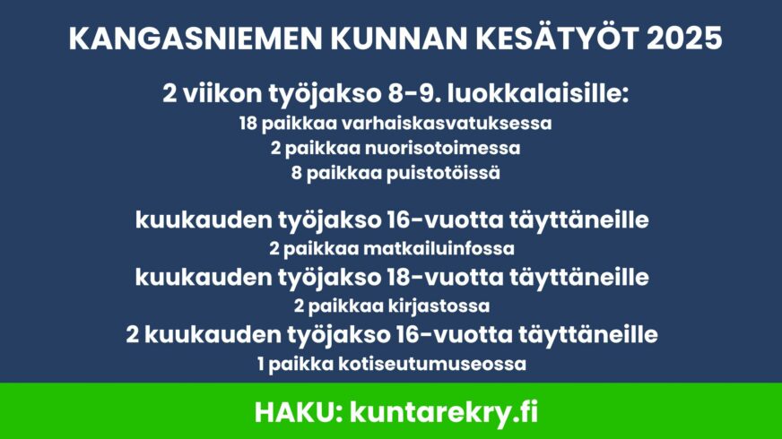 Kangasniemen kunnan kesätyöpaikat nuorille ovat nyt haettavissa kuntarekry.fi:n kautta.