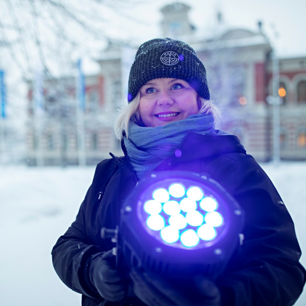 Mikkeliläinen valaistussuunnittelija ja valotaiteilija Elisa Hillgen on toiminut valaistusalalla yrittäjänä pian 16 vuotta. Hän työskentelee konsulttina Jyväskylän kaupungilla Valon kaupunki -hankkeessa, jossa hänellä on yhteistyökumppanina mm. Tehomet Oy. Elisa Hillgen työskentelee pääasiassa kaupunkivalaistuksen ja erikoiskohteiden parissa, mutta nykyään toteuttaa paljon myös valoteoksia ja erilaisia teemavalaistuksia – kuten tämä tuleva Kunnantalon valaistus Kangasniemen nuorisotoimen järjestämässä Kauhujen yö -tapahtumassa. Tehomet Oy mahdollistaa tämän valotaideteoksen toteutuksen Kangasniemellä.