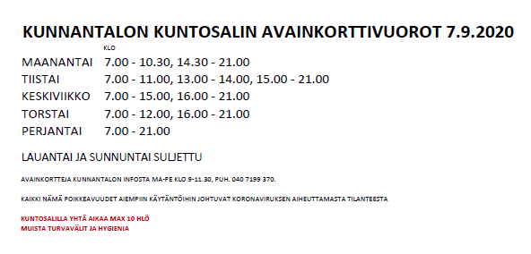 Kuntosali on avoinna avainkorttilaisille seuraavan listan mukaisesti 7.9.2020 alkaen: