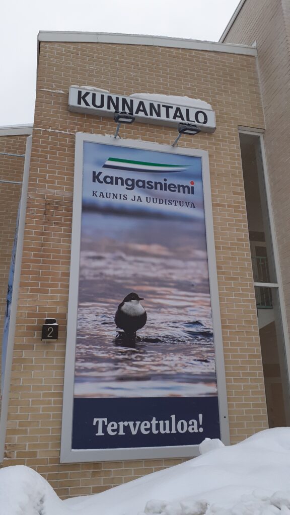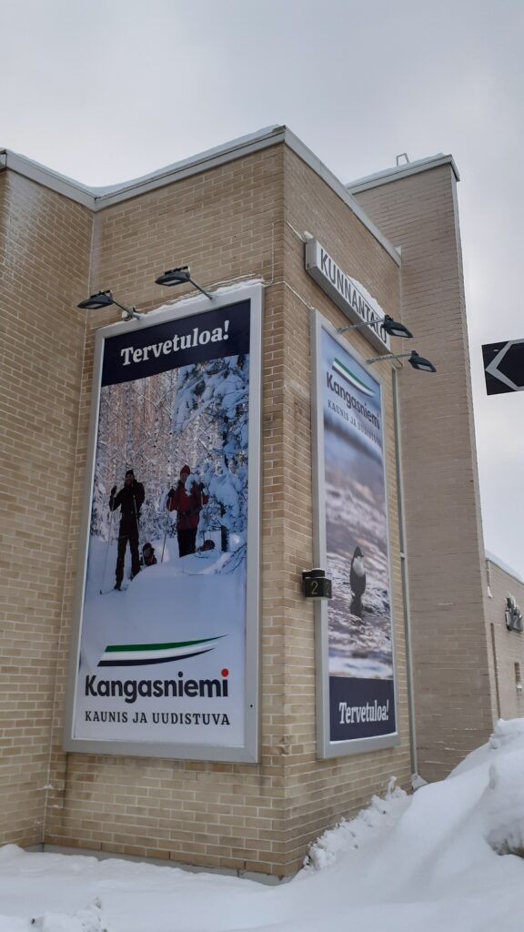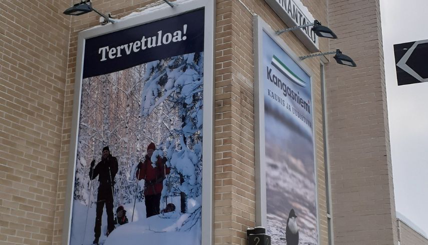 Kunnan uudet talviset seinämainokset uudella visuaalisella ilmeellä. Hiihtokuvan on ottanut Eero Valanko ja Läsäkoskelle viihtyvän koskikaran on kuvannut Mika Ollikainen.