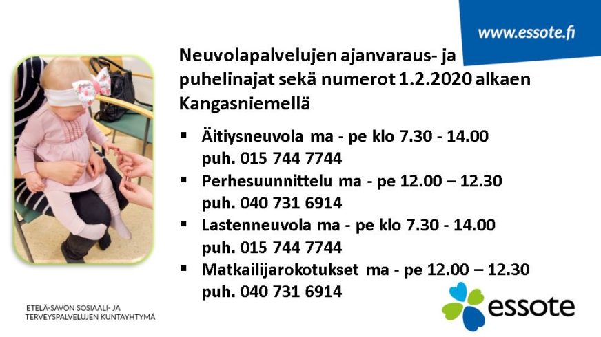 Julkaistu: 28.1.2020 Muutoksia neuvolan tietoihin Neuvolapalvelujen ajanvaraus- ja puhelinajat sekä numerot 1.2.2020 alkaen.