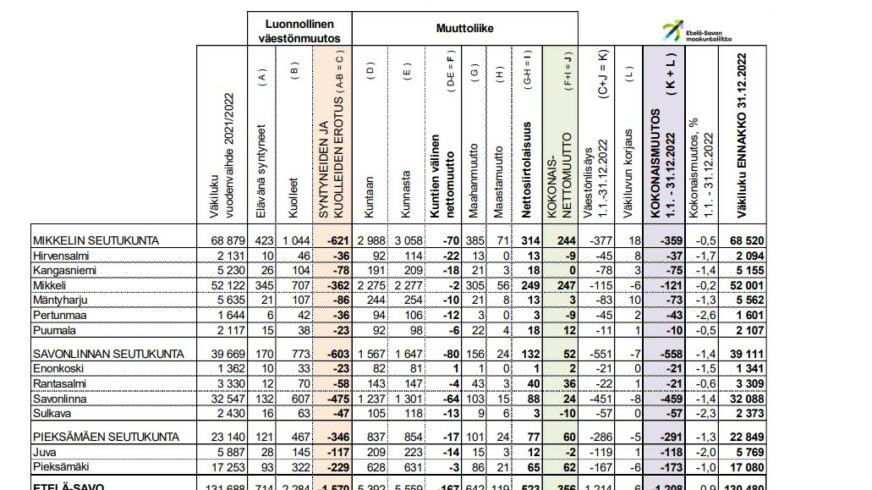 Väestönmuutosten ennakkotietoja kunnittain Etelä-Savossa 1.1.-31.12.2022 (pdf)