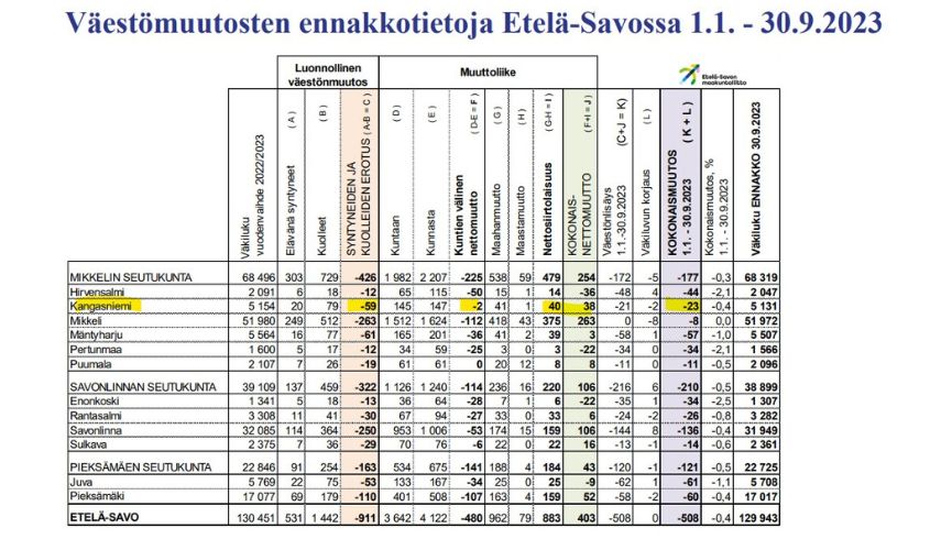 Kangasniemen muuttoliike on maahanmuuton ansiosta positiivinen 38 henkilön verran. Kokonaisväkiluku Kangasniemellä on 1.1.-30.9.2023 välisenä aikana pienentynyt 23 henkilöllä asukasluvun ollessa syyskuun lopussa 5131.