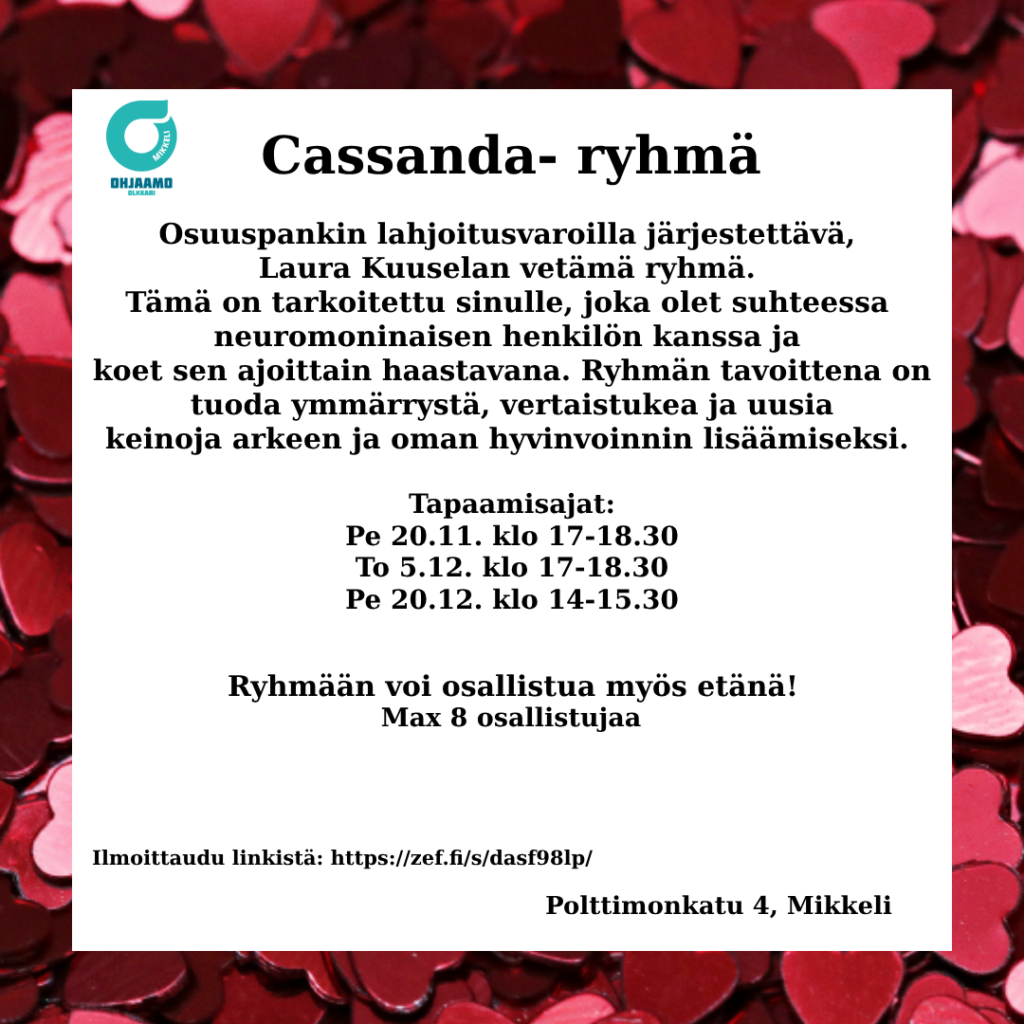 Cassanda ryhmän linkki: https://zef.fi/s/dasf98lp/