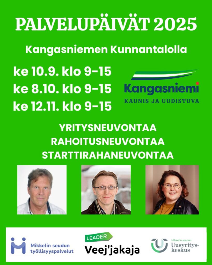 Lisätiedot ja ajanvaraus palvelupäiviin esim. Teijalta 040-199 60 66 teija.skytta@kangasniemi.fi