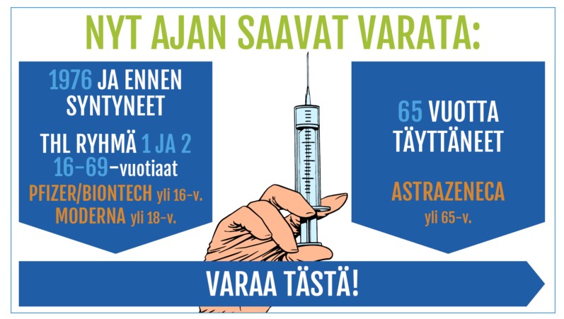 Julkaistu: 7.5.2021 Koronarokotusten ajanvaraus avattu vuonna 1976 ja sitä ennen syntyneille. 1976 tai ennen syntynyt, tai 16-69-vuotias THL:n riskiryhmiin 1 tai 2 kuuluva, tai yli 65-vuotias, VARAA AIKA TÄSTÄ.