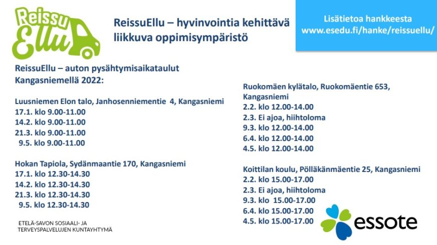 Julkaistu: 3.1.2022 ReissuEllu – hyvinvointia kehittävä liikkuva oppimisympäristö Kevään 2022 aikataulut Luusniemellä, Ruokomäessä, Hokassa sekä Koittilassa.