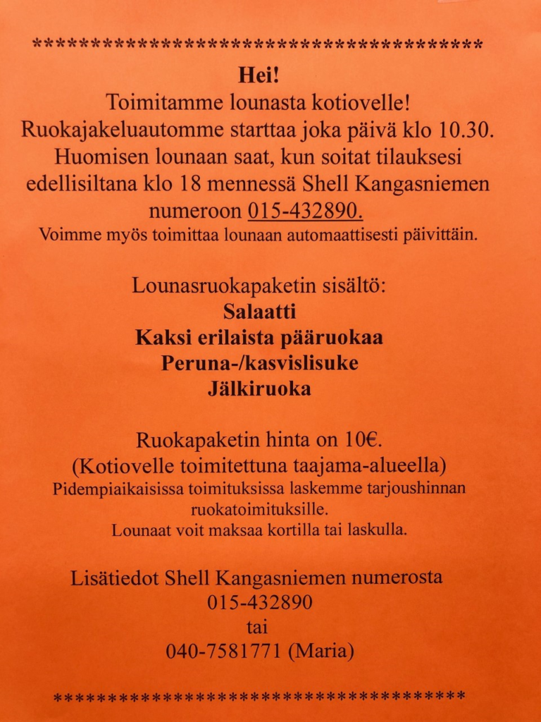 Julkaistu: 25.3.2020 Shelliltä ruokakuljetukset myös kotiin Lounasta mahdollisuus saada kotiin kuljetettuna myös Shelliltä.