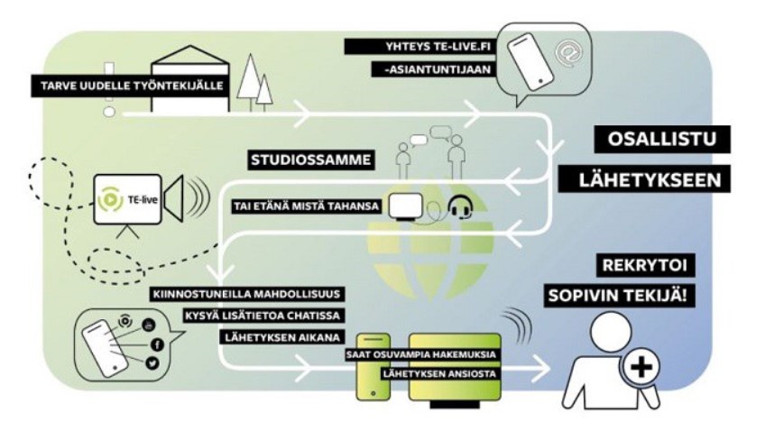 TE-live tarjoaa työnhakijalle mahdollisuuden saada lisätietoa työnantajasta ja -paikasta jo ennen työpaikan hakemista. Lisäksi TE-livessä tuotetaan muun muassa lähetyksiä alueen RekryKoulutuksista ja työvoimakoulutuksista.
