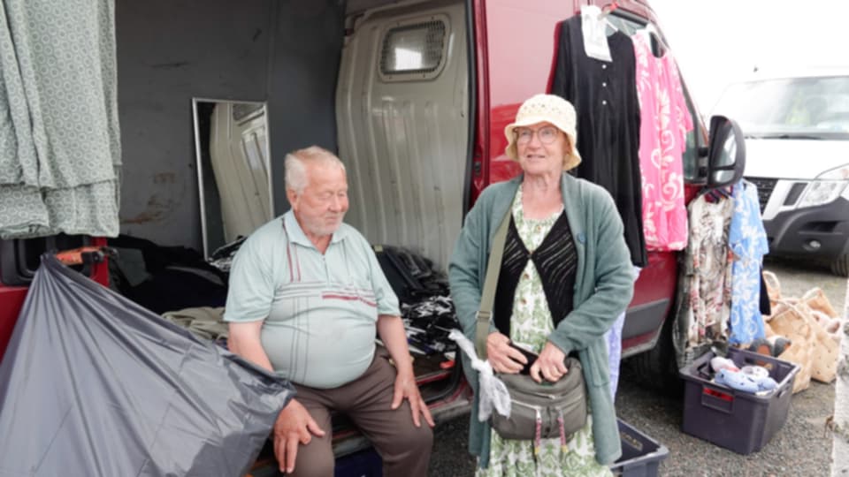 Aivan rannan tuntumassa on vaatekoju. Iäkäs mies istuu pakettiauton tavaratilan reunalla ja syö sämpylää. Rouva tekee kauppaa.