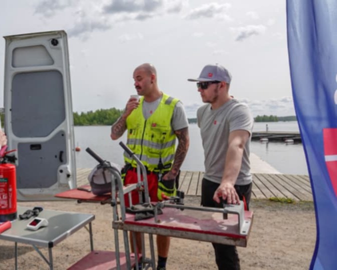 – Vaahtosammutin pitää varmistaa kahden, autossa ja veneessä vuoden välein. Yleinen kunto, letkut ja toimivuus täytyy tarkastaa. Kymmenen vuoden jälkeen pitää laite koeponnistaa ja tarvittaessa uusia, opastavat miehet.