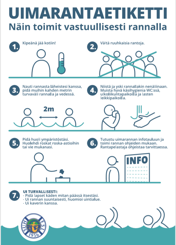 Kesä tulee, oletko valmis nauttimaan uimarannoista vastuullisesti? Koronaviruspandemian takia on tärkeää huomioida viranomaisten ohjeistukset ja määräykset. Ulkoilua ei kannata kuitenkaan lopettaa, vaan ulkoilla vastuullisesti. Suomen Uimaopetus- ja Hengenpelastusliitto (SUH) on julkaissut Uimarantaetiketin pandemian ajaksi.