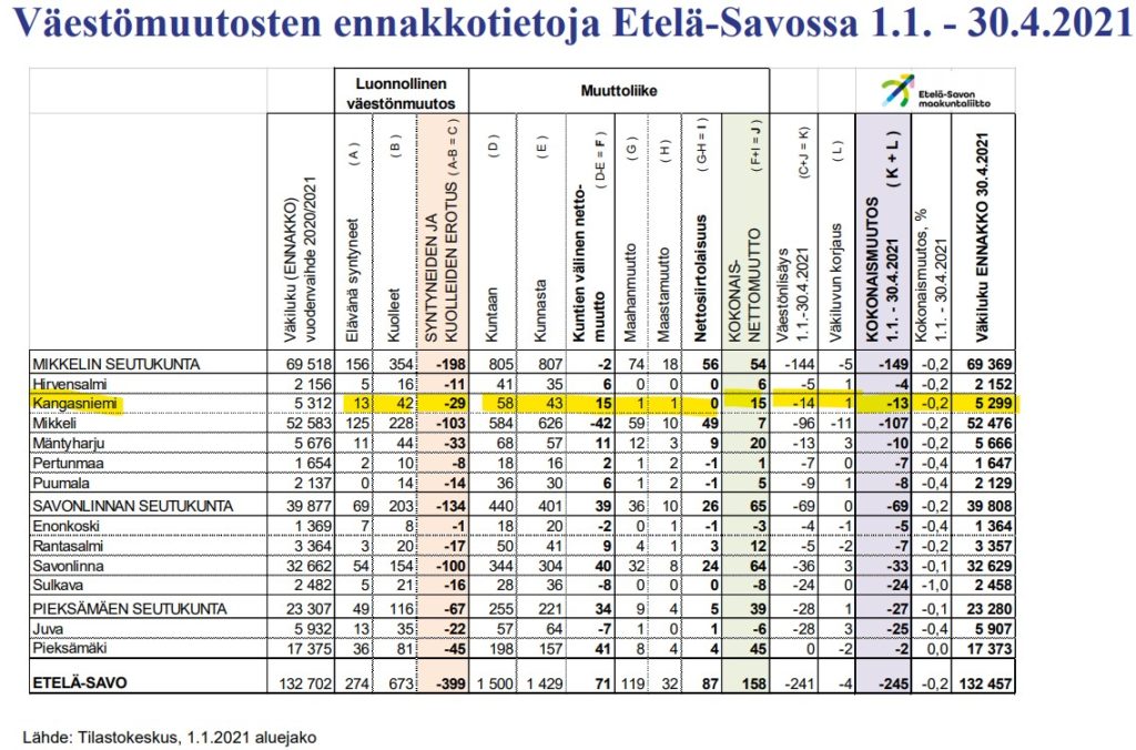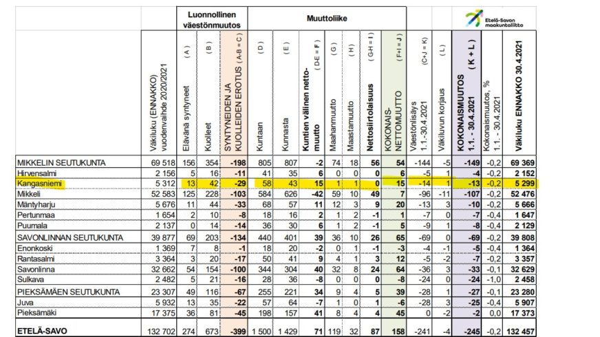 Tilastokeskuksen väestönmuutosten ennakkotietojen mukaan väkiluku väheni Etelä-Savossa tammi-huhtikuun 2021 aikana yhteensä 245 henkilön verran. Väestönmuutos oli vähemmän miinuksella kuin aiempina lähivuosina. Edellisenä vuonna tammi-huhtikuussa väkiluku väheni yhteensä 300 henkilön verran (sitä ennen vuonna 2019: -631 ja 2018: -744). Etelä-Savon ennakkoväkiluku oli huhtikuun 2021 lopussa 132 457.