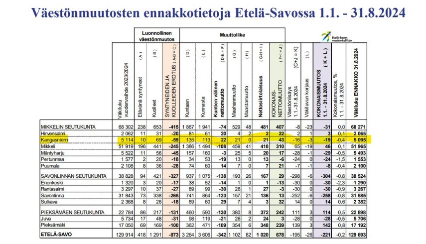 Tilastokeskuksen väestönmuutosten ennakkotietojen mukaan väkiluku väheni Etelä-Savossa tammi-elokuussa 2024 yhteensä 221 henkilön verran (-0,17 prosenttia). Alkuvuoden positiivinen kehitys kääntyi miinukselle kumulatiivisesti katsottuna heinäkuussa, vaikka väestö on vähentynyt kuukausittain katsottuna kesäkuusta lähtien, ja lisäksi huhtikuussa tuli hieman muuttotappiota.