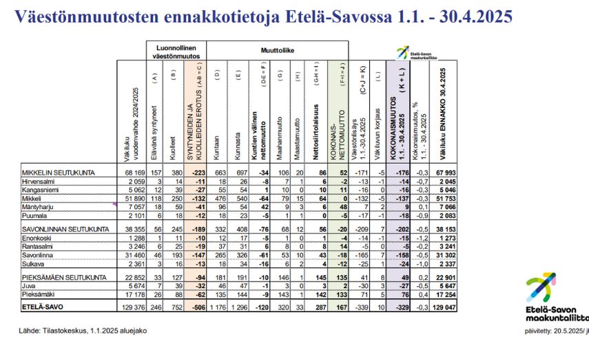 Tilastokeskuksen väestönmuutosten ennakkotietojen mukaan väkiluku väheni Etelä-Savossa tammi-huhtikuussa 2025 yhteensä 329 henkilön verran (-0,25 prosenttia).