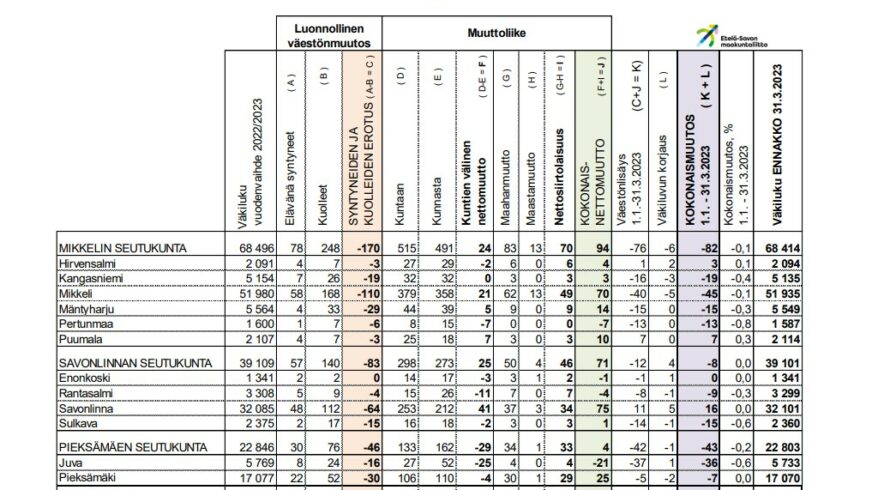 Väestönmuutosten ennakkotietoja kunnittain Etelä-Savossa 1.1.-31.3.2023 (pdf)