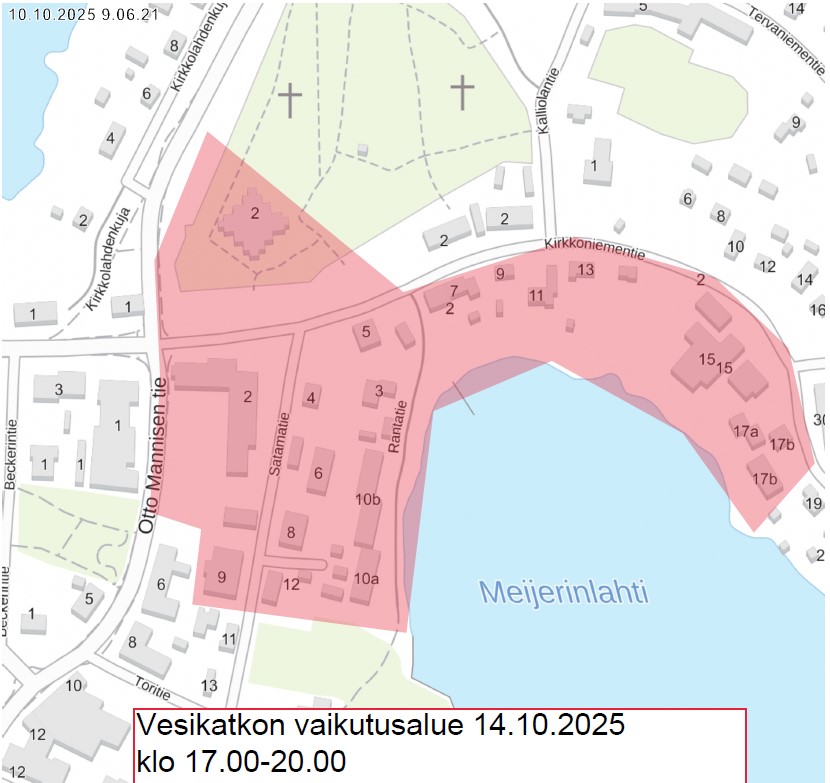 Vesiverkoston huoltotöiden vuoksi veden saanti keskeytyy tiistaina 14.10.2025 klo 17.00–20.00. Katko saattaa olla ilmoitettua lyhyempi. Katkon jälkeen vedessä saattaa esiintyä sakkaa tai värjäymää. Vettä suositellaan juoksutettavaksi haitan vähentämiseksi.