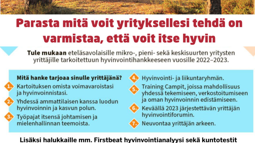 Hyvä kangasniemeläinen yrittäjä! Nyt on vielä mahdollista lähteä mukaan eteläsavolaisille yrittäjille tarkoitettuun hyvinvointihankkeeseen. Ryhmässä on vielä tilaa.