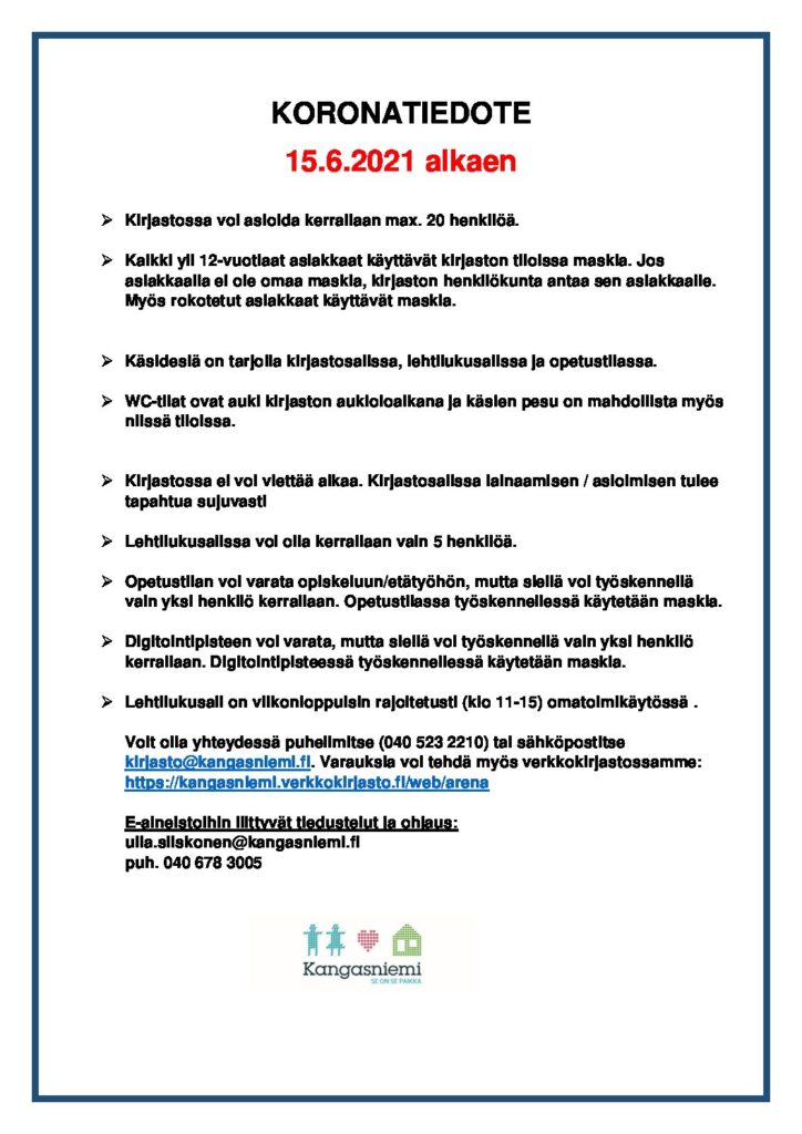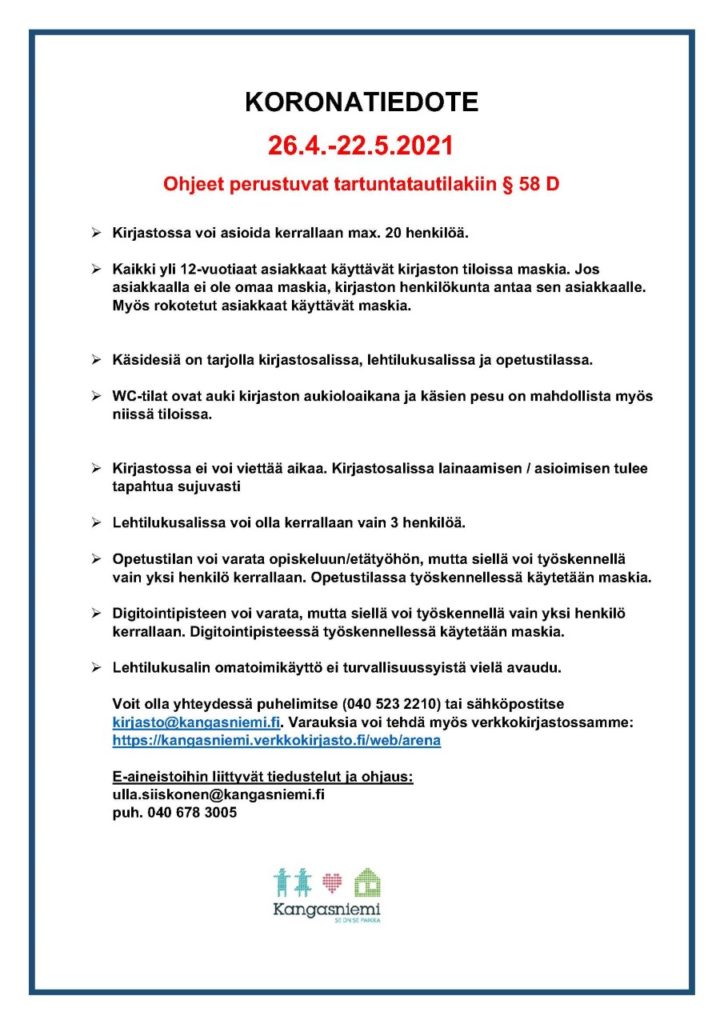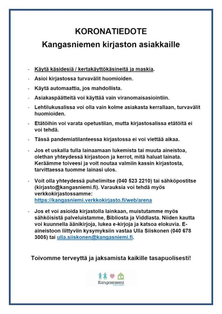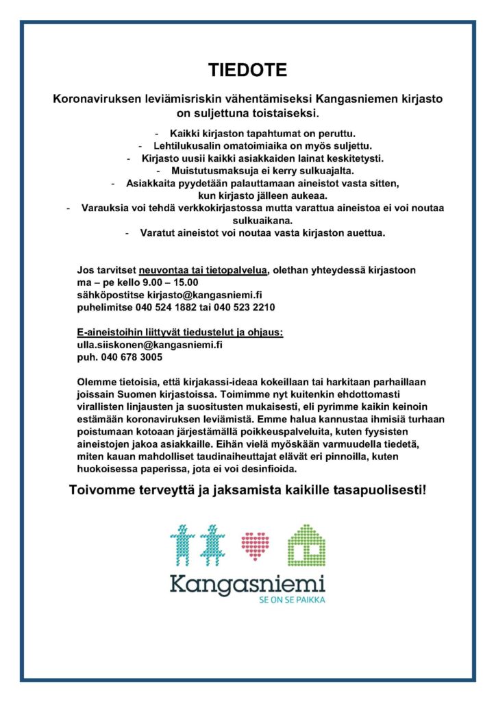 Kannustamme asiakkaitamme tutustumaan myös kirjastomme e-aineistoihin Biblioon ja Viddlaan. Jos tarvitset ohjeistusta näiden palveluiden käyttöönotossa, olethan yhteydessä sähkäpostitse tai puhelimitse: ulla.siiskonen@kangasniemi.fi tai 040 678 3005.