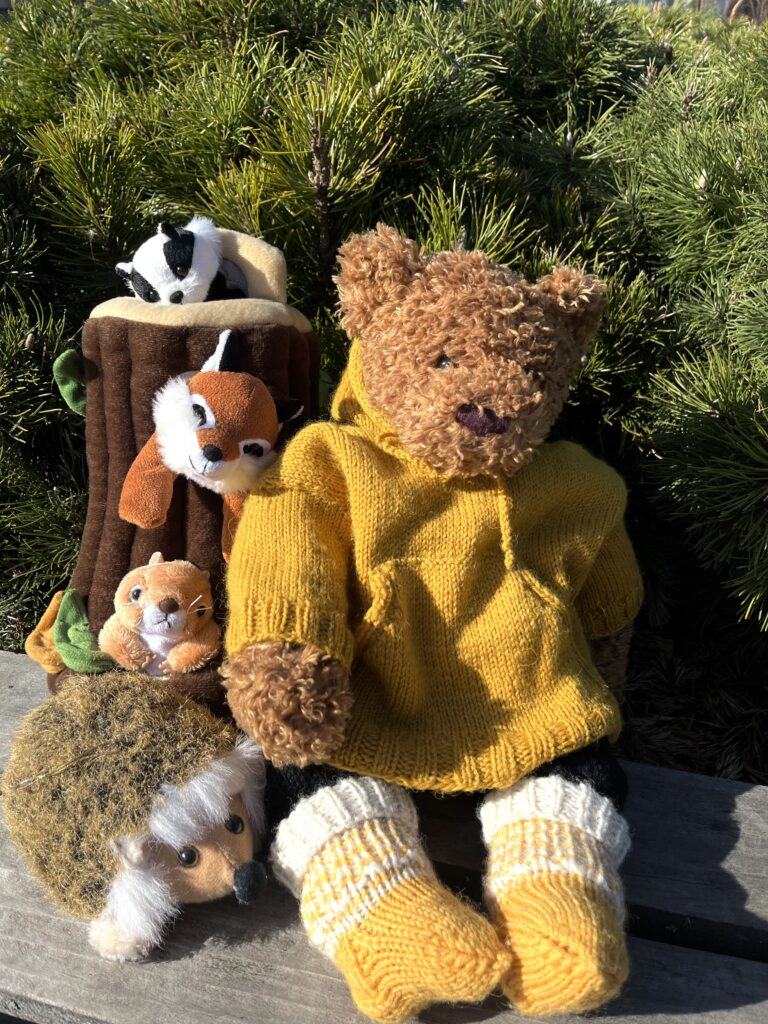 Kuvassa on kirjaston Niilo Nalle, joka on myös mukana kirjaston satutuokioilla. Syksyn 2025 satutuokioiden teemana on luonto, ja satutuokioissa luetaankin joka kerta jokin luontoon liittyvä kirja.