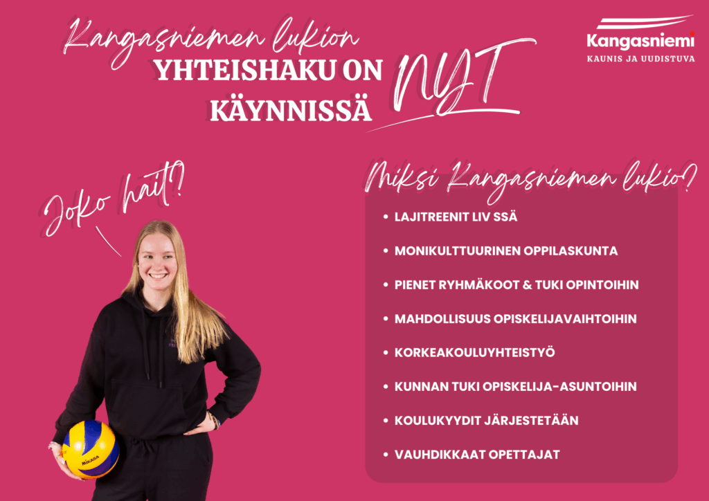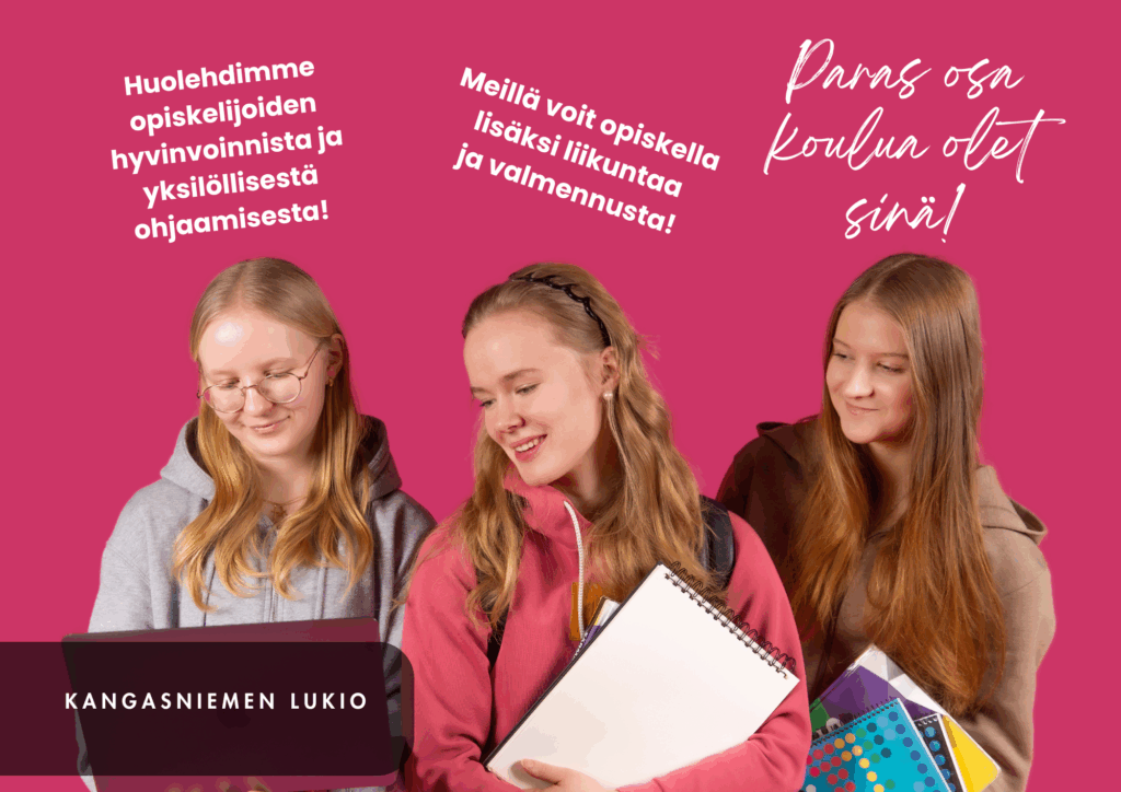 Lukiossamme panostetaan opiskelijoiden hyvinvointiin ja yksilölliseen ohjaamiseen. Olemme liikkuva lukio ja mukana hyvinvointi-/urheiluvalmennuksessa. Hyödynnämme kunnan upeita liikuntamahdollisuuksia. Lukiomme tarjoaa myös mahdollisuuden opiskella yrittäjyyttä ja taloustaitoja. Teemme yhteistyötä Kangasniemen yrittäjien kanssa.