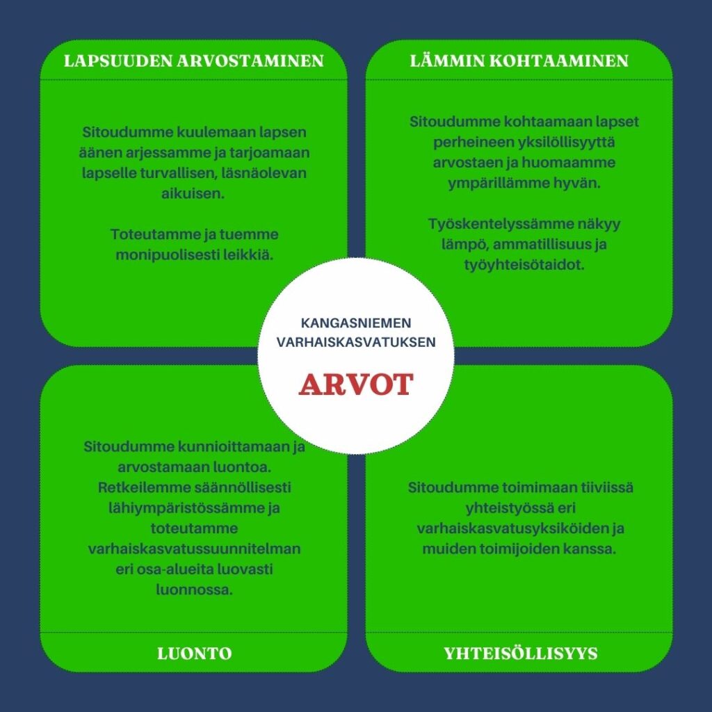 Varhaiskasvatustoimintaamme ohjaavat arvot ovat lapsuuden arvostaminen, lämmin kohtaaminen, luonto ja yhteisöllisyys. Arvot näkyvät jokapäiväisessä toiminnassamme.